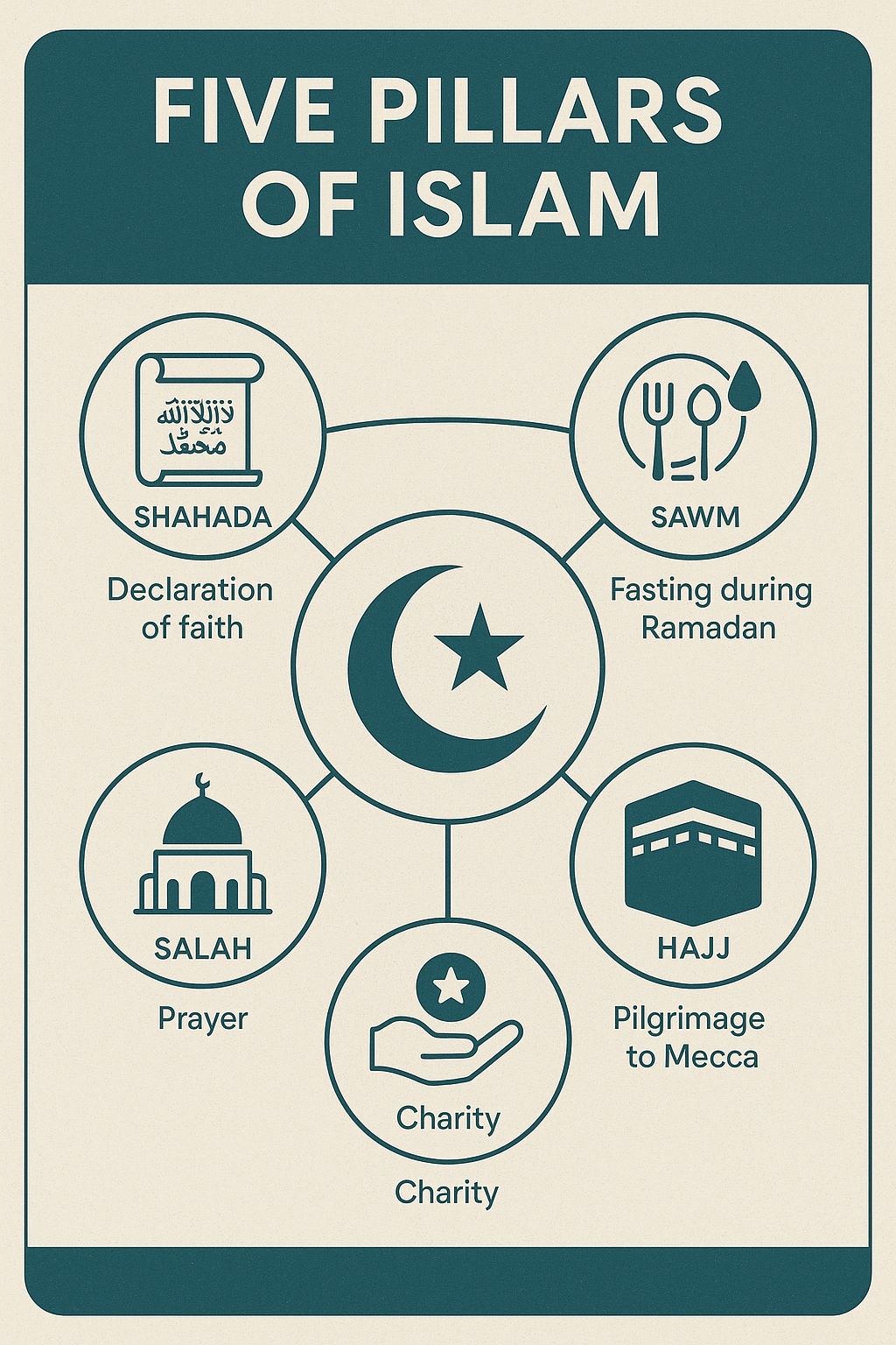 Islam rests on five fundamental pillars that structure Muslim religious life: the declaration of faith (shahada), prayer (salah), charity (zakat), fasting during Ramadan (sawm), and pilgrimage to Mecca (hajj). These practices create rhythms of individual devotion and community solidarity while expressing Islam’s emphasis on submission to divine will in all aspects of life.